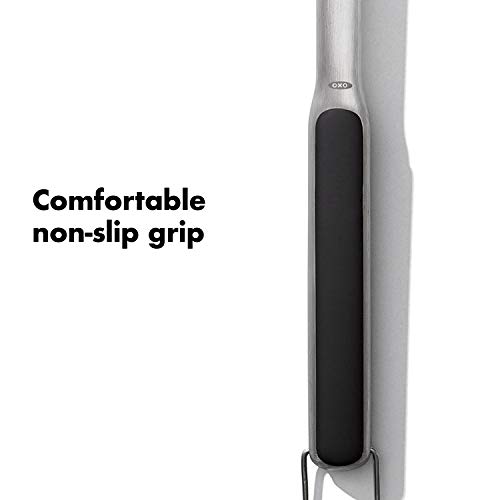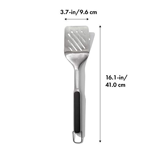 De OXO Good Grips Barbecuespatel is perfect voor het omdraaien van hamburgers, visfilets, karbonades en ander vlees op de grill. De stevige, afgeschuinde kop glijdt moeiteloos onder je eten terwijl het gebogen ontwerp als een hefboom werkt. Met een comfortabele antisliphandgreep en een handige ring om hem aan de barbecue op te hangen, zul je deze spatel keer op keer tevoorschijn halen als er gegrild moet worden. Vaatwasmachinebestendig.
